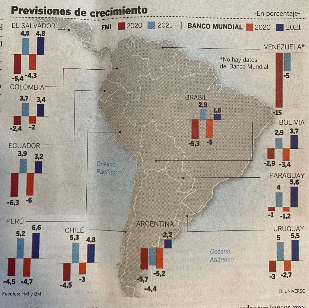 Ecuador, the hardest hit, will decrease 2020 in -6.3%, followed by Argentina with -5.7% (the data excludes Venezuela).